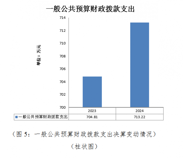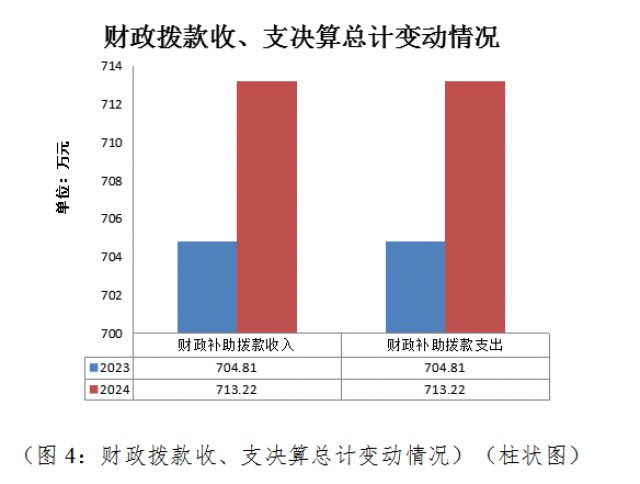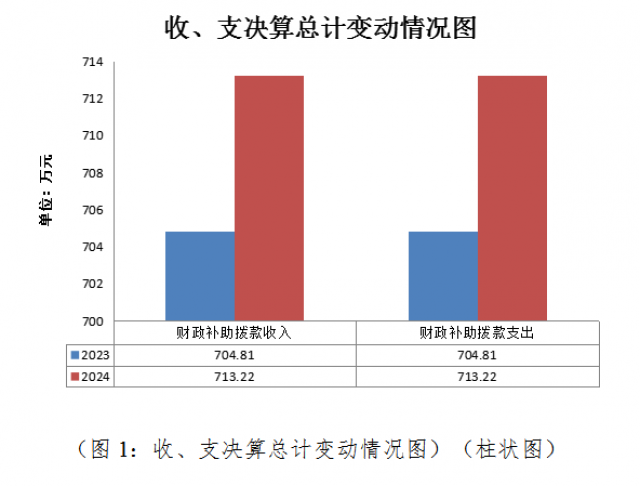 2024年度收、支总计713.22万元。与2023年相比,收、支总计各增加8.41万元,增长1.18%。主要变动主要原因是在职职工每年正常晋升晋级基本工资增加。