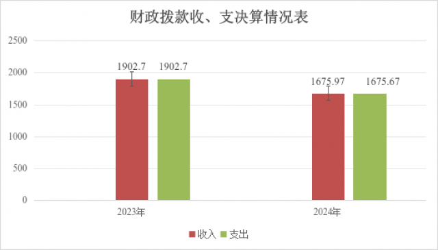 2024年度财政拨款收入、支出总计均为1675.67万元。与2023年度相比,财政拨款收入总计、支出总计各减少227.03万元,下降11.93%。主要变动原因是人员结构变动,在职人员退休,编制调整等导致基本支出中人员经费减少。