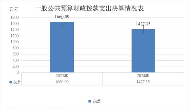 2024年度一般公共预算财政拨款支出1427.35万元,占本年支出合计的85.18%。与2023年度相比,一般公共预算财政拨款支出减少232.74万元,下降14.02%。主要变动原因是人员结构变动,在职人员退休,编制调整等导致基本支出中人员经费减少。