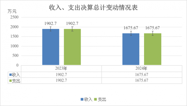 2024年度收入、支出总计均为1675.67万元。与2023年度相比,收入、支出总计各减少227.03万元,下降11.93%。主要变动原因是人员结构变动,在职人员退休,编制调整等导致基本支出中人员经费减少。