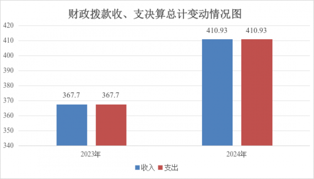 2024年度财政拨款收入、支出总计均为410.93万元。与2023年度相比,财政拨款收入总计、支出总计各增加43.23万元,增长11.76%。主要变动原因是人员增加