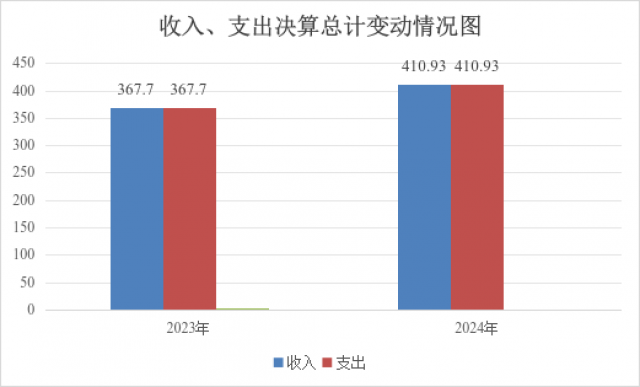 2024年度收入、支出总计均为410.93万元。与2023年度相比,收入、支出总计各增加43.23万元,增长11.76%。主要变动原因是人员增加。