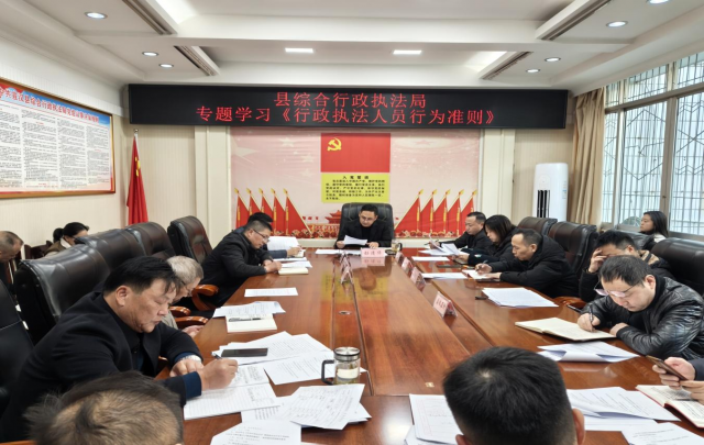 为深入贯彻落实全面依法治国基本方略,进一步提升综合行政执法队伍规范化、专业化、法治化水平,2025年11月20日,宣汉县综合行政执法局组织召开专题学习会议,集中学习司法部最新颁布的《执法人员行为准则》(以下简称《准则》)。局党组书记、局长彭清华同志主持学习并作动员讲话,局领导班子全体成员、各部门负责人及执法骨干代表参加学习。