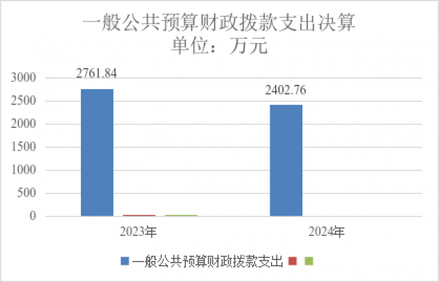 2024年度一般公共预算财政拨款支出2402.76万元,占本年支出合计的97.43%。与2023年度2761.84万元 相比,一般公共预算财政拨款减少359.08万元,减少率13%。主要变动原因是2024年项目支出减少。