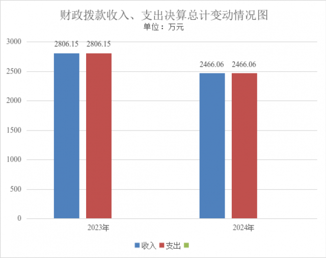 2024年度财政拨款收入、支出总计均为2466.06万元。与2023年度2806.15万元相比,财政拨款收入总计、支出总计各减少340.09万元,下降12.12%。主要变动原因是厉行节约,压减部门项目资金。