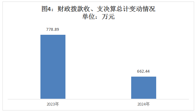 2024年度财政拨款收入、支出总计均为662.44万元。与2023年度778.89万元相比,财政拨款收入总计、支出总计各减少116.45万元,下降14.95%。主要变动原因是在职职工退休3人。