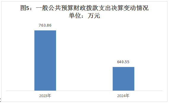 2024年度一般公共预算财政拨款支出640.55万元,占本年支出合计的96.69%。与2023年度763.86万元相比,一般公共预算财政拨款支出减少123.31万元,下降16.14%。主要变动原因是在职职工退休3人。