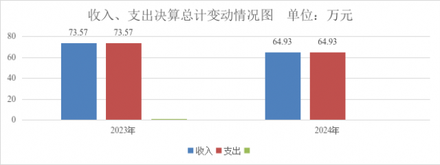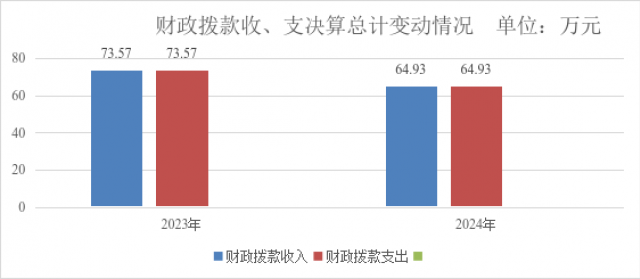 2024年度财政拨款收入、支出总计均为64.93万元。与2023年度73.57万元相比,财政拨款收入总计、支出总计各减少8.64万元,下降11.74%。主要变动原因是部门项目支出减少。