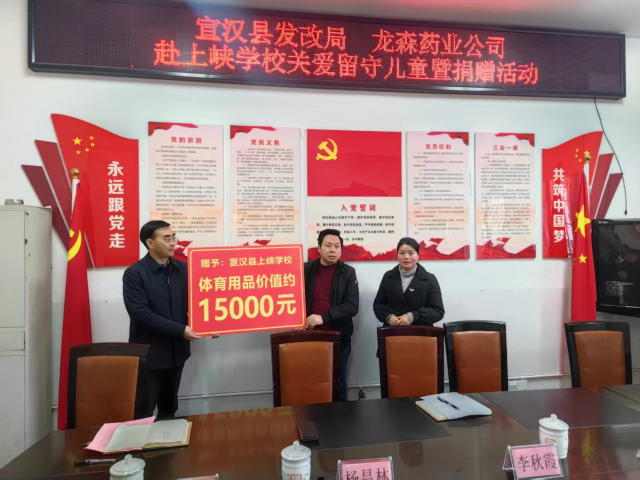 捐赠仪式上,上峡学校党支部书记、校长周鹏代表全体师生对县发改局和四川省龙森中药业有限公司一行的到来表示热烈的欢迎,并详细介绍了上峡学校近些年的发展变化及留守儿童周末假日寄宿学校的开展情况。县发改局党组成员、机关党委书记李秋霞代表单位向全校师生表达了亲切的问候,详细了解留守儿童学习、生活及家庭情况,鼓励孩子们要树立远大理想,以乐观向上的心态生活和学习,努力成长为担当民族复兴大任的时代新人。随后,县发改局和四川省龙森中药业有限公司为留守儿童代表发放了篮球、羽毛球拍、乒乓球桌等价值15000元的体育用品,每一份物资都承载着县发改局对孩子们的深切关爱与美好期许。