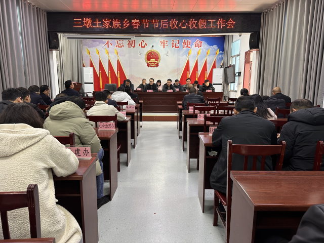 为确保全体干部职工迅速从节日氛围中调整状态,以饱满的热情和务实的作风投入到新一年工作中,2月24日上午,三墩土家族乡组织召开节后收假收心工作会议,乡党政领导班子成员、全体机关干部、各村(社区)主要负责人参加会议。