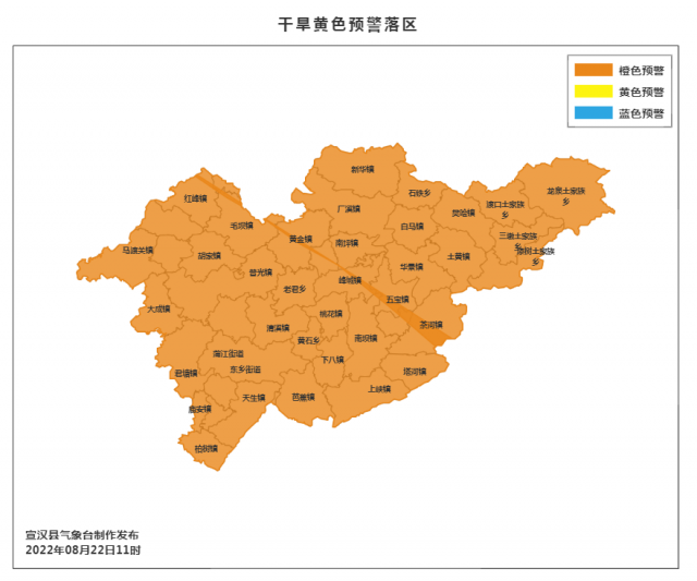 宣汉县气象台2022年08月22日11时38分将2022年08月13日14时49分发布的干旱黄色预警变更为干旱橙色预警:目前我县气象干旱综合指数(MCI)为重旱,局地达特旱。预计8月23日到8月27日,我县仍将维持高温少雨天气,最高气温可达39~41℃,部分低海拔地区将超过42℃,气象干旱等级将进一步上升,高温热害及干旱影响还将进一步加剧,农业干旱严重,人畜饮水困难和农作物因旱受灾程度将进一步加深,水利工程蓄水进一步减少且补充困难。请各地各相关部门做好防暑降温、用水用电计划、防火管理等工作;森林气象火险等级高,请做好森林防灭火工作。