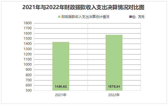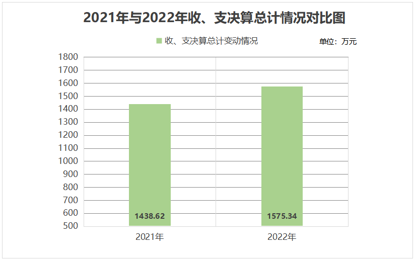 2022年度收、支总计1575.34万元。与2021年相比,收、支总计各增加136.72万元,增长9.5%。主要变动原因是1.人员类经费增加2.发展乡镇经济,项目增加,办公经费增加。