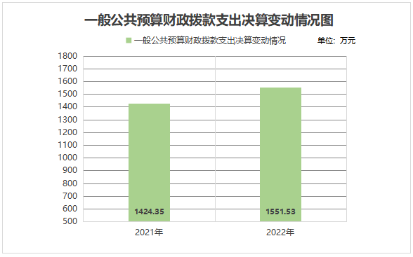 2022年一般公共预算财政拨款支出1551.53万元,占本年支出合计的98.49%。与2021年相比,一般公共预算财政拨款支出增加127.18万元,增长8.93%,主要变动原因是人员类支出增加。