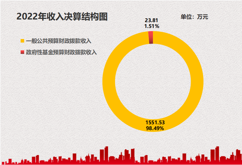 2022年收入合计1575.34万元,其中:一般公共预算财政拨款收入1551.53万元,占98.49%;政府性基金预算财政拨款收入23.81万元,占1.51%;国有资本经营预算财政拨款收入0万元,占0%;上级补助收入0万元,占0%;事业收入0万元,占0%;经营收入0万元,占0%;附属单位上缴收入0万元,占0%;其他收入0万元,占0%。