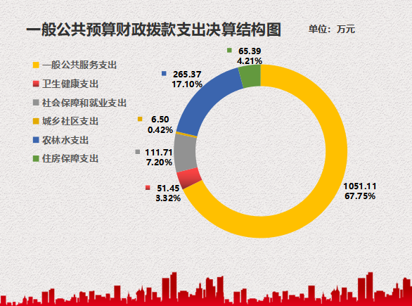 2022年一般公共预算财政拨款支出1551.53万元,主要用于以下方面:一般公共服务支出1051.11万元,占67.75%;社会保障和就业支出111.71万元,占7.2%;卫生健康支出51.45万元,占3.32%;城乡社区支出6.5万元,占0.42%;农林水支出265.37万元,占17.1%;住房保障支出65.39万元,占4.21%。