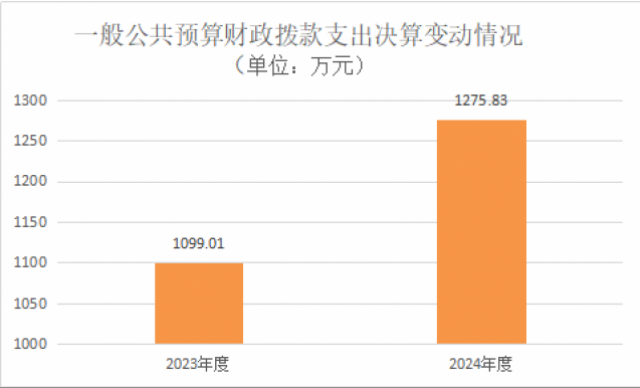 2024年度一般公共预算财政拨款支出1275.83万元,占本年支出合计的100%。与2023年度相比,一般公共预算财政拨款支出增加176.82万元,增长16%。主要变动原因是本年度工作人员增加了两人,地方一次性经济和立功受奖奖励金的发放比上年度有所增加。