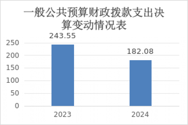 2024年度财政拨款收入、支出总计均为182.08万元。与2023年度相比,财政拨款收入总计、支出总计减少61.47万元,下降25.2%。主要变动原因是2023年度购置专用设备,本年度未购置。