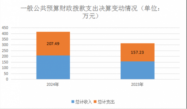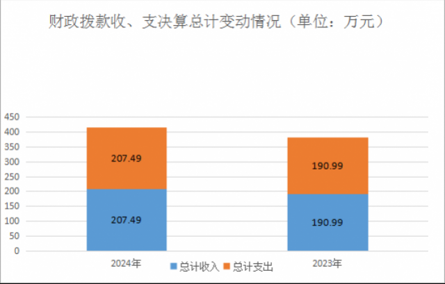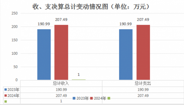 2024年度收入、支出总计均为207.49万元。与2023年度相比,收入、支出总计各增加16.5万元,增长8.64%。主要变动原因是基本支出增加10.27万元,项目支出增加6.22万元