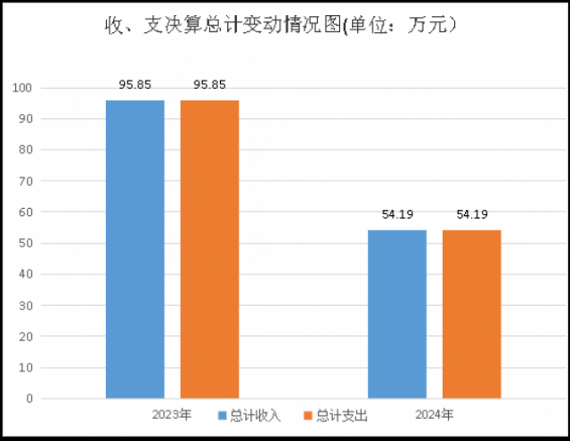 2024年度收入、支出总计均为54.19万元。与2023年度相比,收入、支出总计减少41.66万元,下降43.5%。主要变动原因是赛事服务费支出减少。