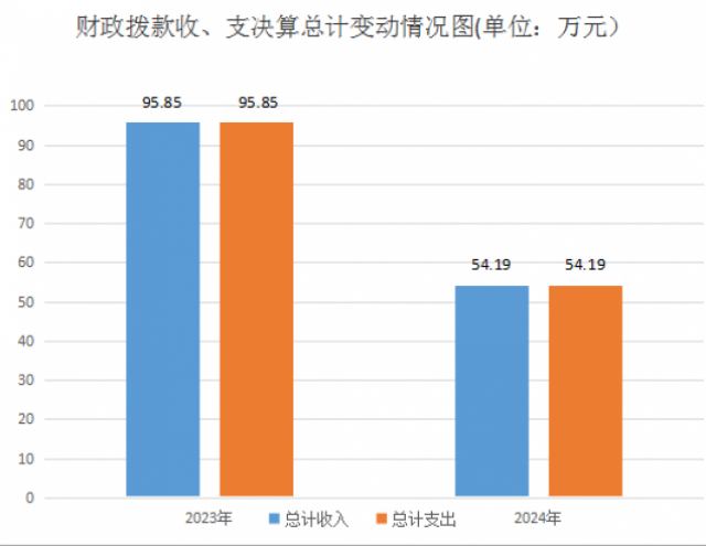 2024年度财政拨款收入、支出总计均为54.19万元。与2023年度相比,财政拨款收入总计、支出总计减少41.66万元,下降43.5%。主要变动原因是赛事服务费支出减少。