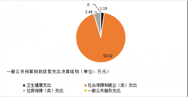2024年度一般公共预算财政拨款支出54.19万元,主要用于以下方面:一般公共服务支出0万元,占0%;教育支出0万元,占0%;科学技术支出0万元,占0%;文化旅游体育与传媒支出0万元,占0%;社会保障和就业支出50.52万元,占93.2%;卫生健康支出1.19万元,占2.2%;住房保障支出2.48万元,占4.6%。