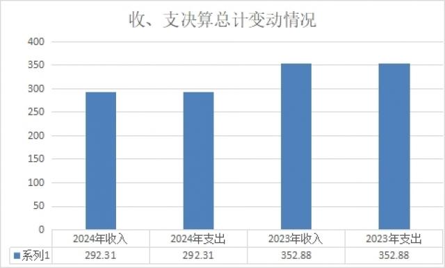 2024年度收入、支出总计均为292.31万元。与2023年度相比,收入、支出总计各减少60.57万元,下降17.16%。主要变动原因是一般公共卫生财政拨款和医疗业务收入减少,同时成本支出减少和人员支出减少。