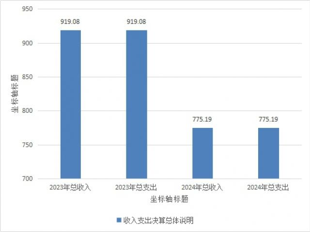 2024年度收入总计775.19万元。与2023年相比,收入总计减少140.89万元,减少16%,主要变动原因是事业收入减少。2024年度支出合计775.19万元,与2023年相比,减少140.89万元,主要变动原因是基本支出减少。