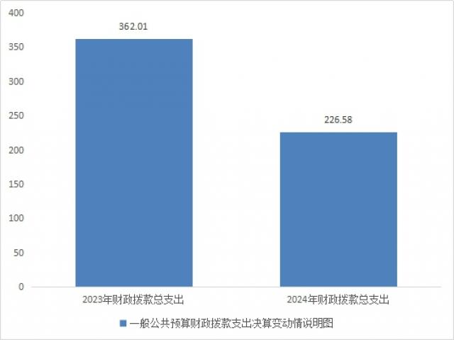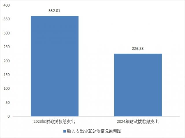 2024年财政拨款收、支分别总计226.58万元。与2023年相比,财政拨款收、支总计各减少135.44万元,减少38%。主要变动原因是基本支出减少和预算减少。