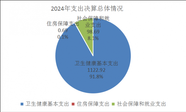 2024年度本年支出合计1222.3万元,其中:卫生健康基本支出1122.92万元,占91.8%;社会保障和就业支出98.69万元,占8.1%;住房保障支出0.69万元,占0.1%。
