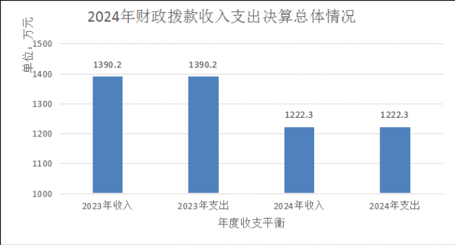 2024年度收、支总计均为1222.3万元。与2023年相比,收、支总计各减少167.9万元,下降12%。主要变动原因是2024年度在编人员转退休4人,辞职1人,故人员类经费减少较多。