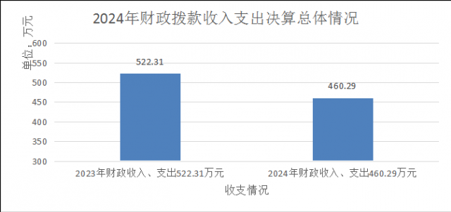 2024年度财政拨款收、支总计460.28万元。与2023年相比,财政拨款收、支总计各减少62.02万元,减少11.9%。主要变动原因是2024年度在编人员转退休4人,辞职1人,人员类经费减少较多。