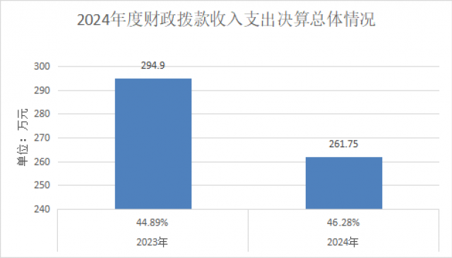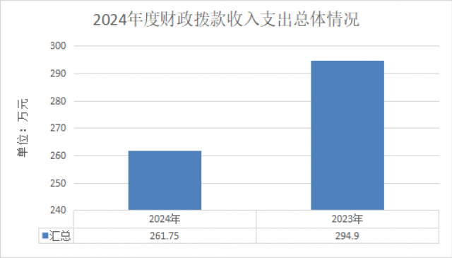 2024年度财政拨款收、支分别261.75万元。与2023年度相比,财政拨款收、支总计各减少33.15万元,降低11.2%。主要变动原因是公共卫生经费减少。