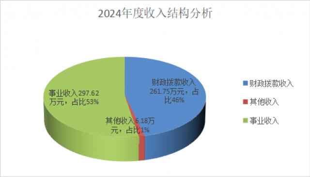 2024年度本年收入合计565.55万元,其中:一般公共预算财政拨款收入261.75万元,占46.3%;事业收入297.62万元,占52.6%;其他收入6.18万元,占1.1%。