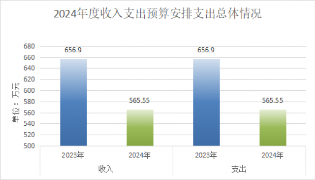2024年度收、支分别565.55万元。与2023年度相比,收、支总计各减少91.35万元,减少13.9%。主要变动原因是单位业务收入减少及公共卫生财政拨款减少。