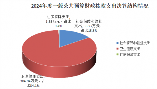2024年度一般公共预算财政拨款支出362.58万元,主要用于以下方面:社会保障和就业支出56.27万元,占15.5%;卫生健康支出304.94万元,占84.1%;住房保障支出1.38万元,占0.4%。