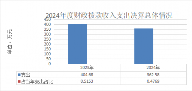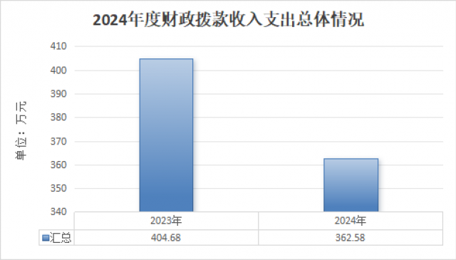 2024年度财政拨款收、支分别362.58万元。与2023年度相比,财政拨款收、支总计各减少42.1万元,降低10.4%。主要变动原因是公共卫生经费减少。