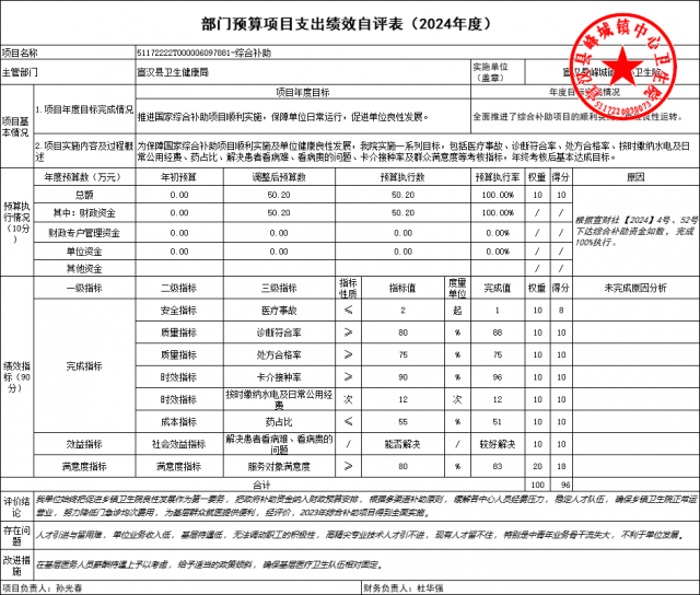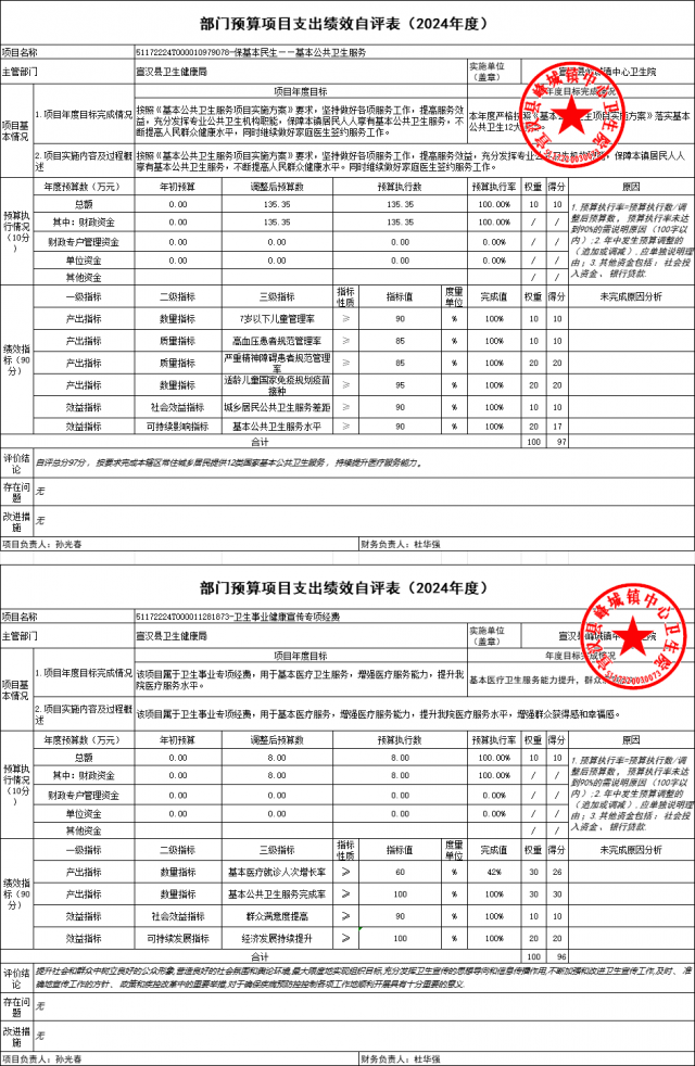 根据预算绩效管理要求,本单位在2024年度预算编制阶段,组织对国家基本公共卫生服务等1个项目开展了预算事前绩效评估,对1个项目编制了绩效目标,预算执行过程中,选取1个项目开展绩效监控,年终执行完毕后。(第四部分)。