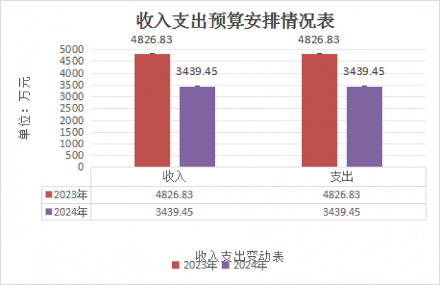 2024年度收入、支出总计均为3439.45万元。与2023年度相比,收入总计减少1387.38万元,下降28.7%。主要变动原因是财政拨款收入减少883.53万元,事业收入减少442.59万元,其他收入减少61.26万元;支出总计减少1387.38万元,主要变动原因是基本支出减少1387.38万元。