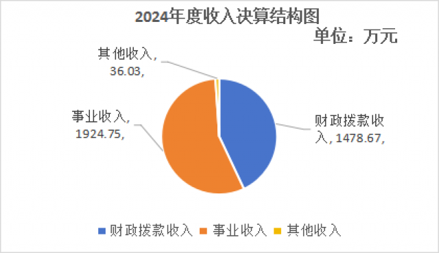 2024年度收入合计3439.45万元,其中:一般公共预算财政拨款收入1478.67万元,占43%;事业收入1924.75万元,占56%;其他收入36.03万元,占1%。
