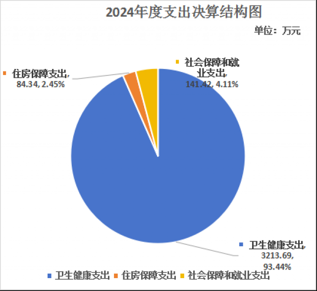 2024年度支出合计3439.45万元,其中:基本支出3439.45万元,占100%;其中:社会保障和就业支出141.42万元,占4.1%;卫生健康支出3213.69万元,占93.4%;住房保障支出84.34万元,占2.5%。