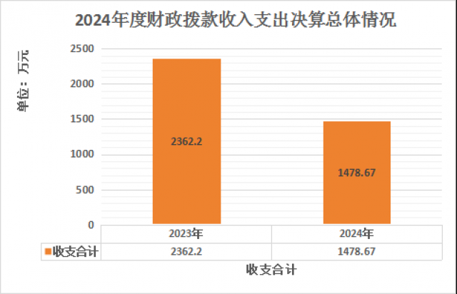 2024年度财政拨款收入、支出总计均为1478.67万元。与2023年度相比,财政拨款收入总计、支出总计各减少883.53万元,下降37.4%。主要变动原因是社会保障和就业支出减少32.11万元,卫生健康支出减少852.07万元,住房保障支出增加0.66万元。