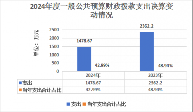2024年度一般公共预算财政拨款支出1478.67万元,占本年支出合计的43%。与2023年度相比,一般公共预算财政拨款支出减少883.53万元,下降37.4%。主要变动原因是基本支出减少883.53万元。