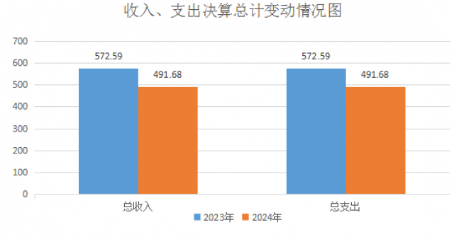 2024年度收入总计491.68万元。与2023年相比,收入总计减少80.91万元,下降14.1%。主要变动原因是财政拨款收入减少57.35万元,事业收入减少60.83万元,其他收入增加37.27万元。2024年度支出合计491.68万元,与2023年相比,减少80.91万元,主要变动原因是卫生健康支出减少32.32万元,社会保障和就业支出减少48.59万元。