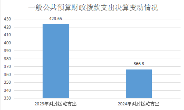 2024年一般公共预算财政拨款支出366.3万元,占本年支出合计的74.5%。与2023年相比,一般公共预算财政拨款支出减少57.35万元,减少13.5%。主要变动原因是工资福利支出减少25.3万元,商品和服务支出增加17.4万元,对个人和家庭的补助支出减少49.45万元。