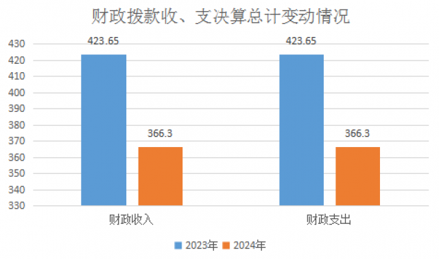 2024年财政拨款收、支总计366.3万元。与2023年相比,财政拨款收、支总计各减少57.35万元,减少13.5%。主要变动原因是社会保障和就业支出减少48.59万元,卫生健康支出减少8.76万元。