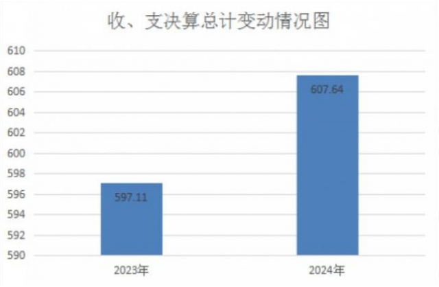 2024年度收入、支出总计均为607.64万元。与2023年相比,收入、支出总计各增加10.53万元,增长1.76%。要变动原因是:一是每年度职工工资正常调增及调整公积金、机关事业单位养老保险缴费、医疗费用等费用基数,由此带来相关费用增加;二是2024年9月新招录1人。