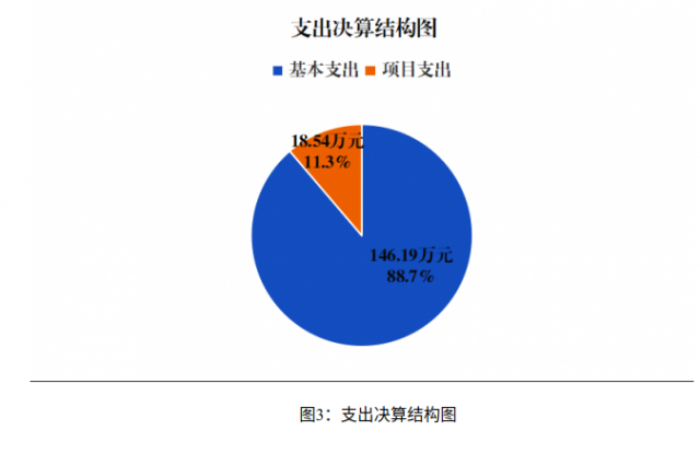 2024年度本年支出合计164.73万元,其中:基本支出146.19万元,占88.7%;项目支出18.54万元,占11.3%;上缴上级支出0万元,占0%;经营支出0万元,占0%;对附属单位补助支出0万元,占0%。