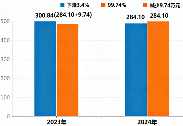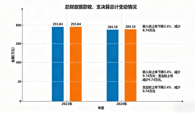 2024年度收入、支出总计均为284.10万元。与2023年度相比,收入、支出总计各减少9.74万元,下降3.4%。主要变动原因是本着政府“过紧日子”要求,厉行节约。