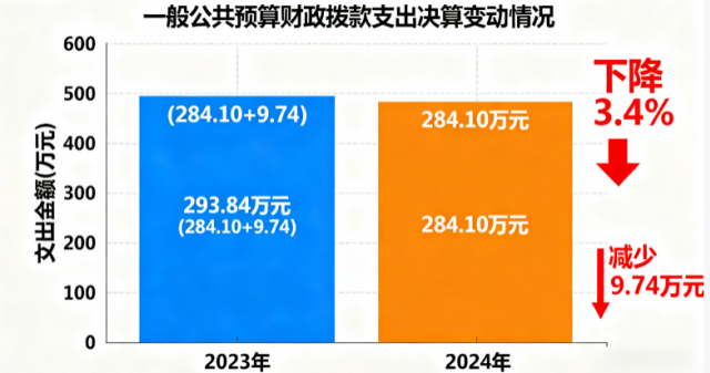 2024年度财政拨款收入、支出总计均为284.10万元。与2023年度相比,财政拨款收入总计、支出总计各减少9.74万元,下降3.4%。主要变动原因是本着政府“过紧日子”要求,厉行节约。