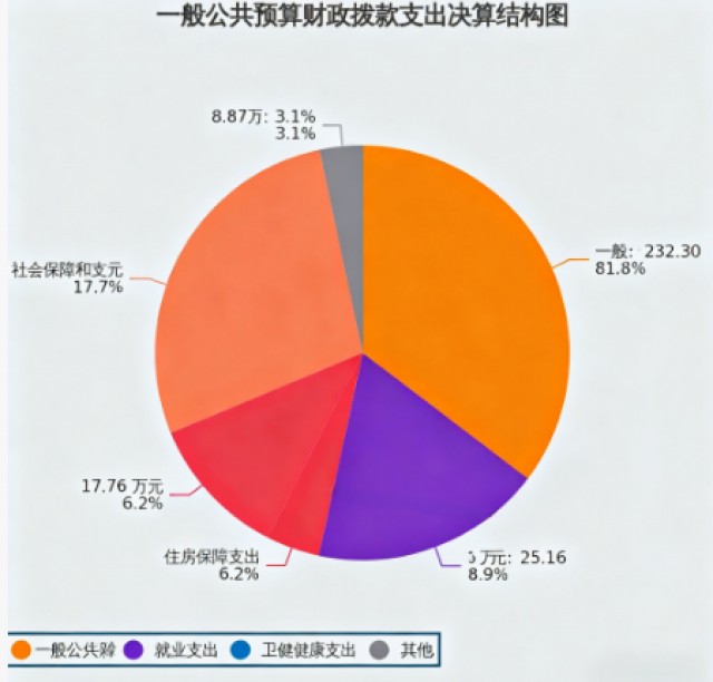 2024年度一般公共预算财政拨款支出284.10万元,主要用于以下方面:一般公共服务支出232.30万元,占81.8%;社会保障和就业支出25.16万元,占8.9%;卫生健康支出8.87万元,占3.1%;住房保障支出17.76万元,占6.2%。